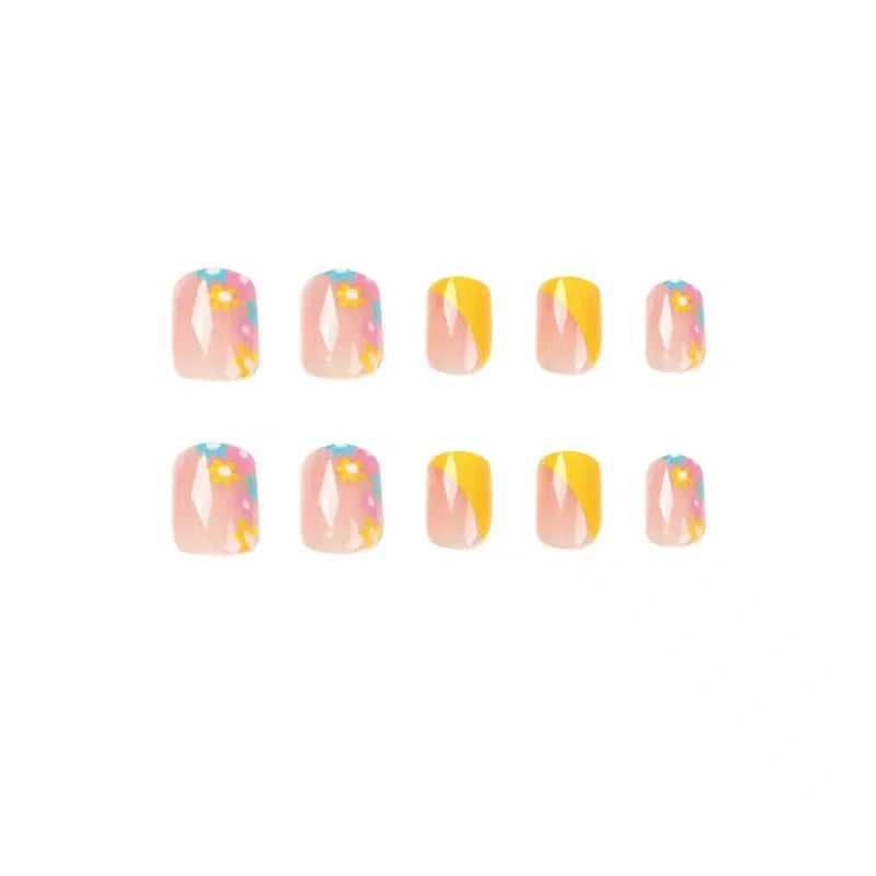 Bright yellow French press-on nails with dainty floral accents.