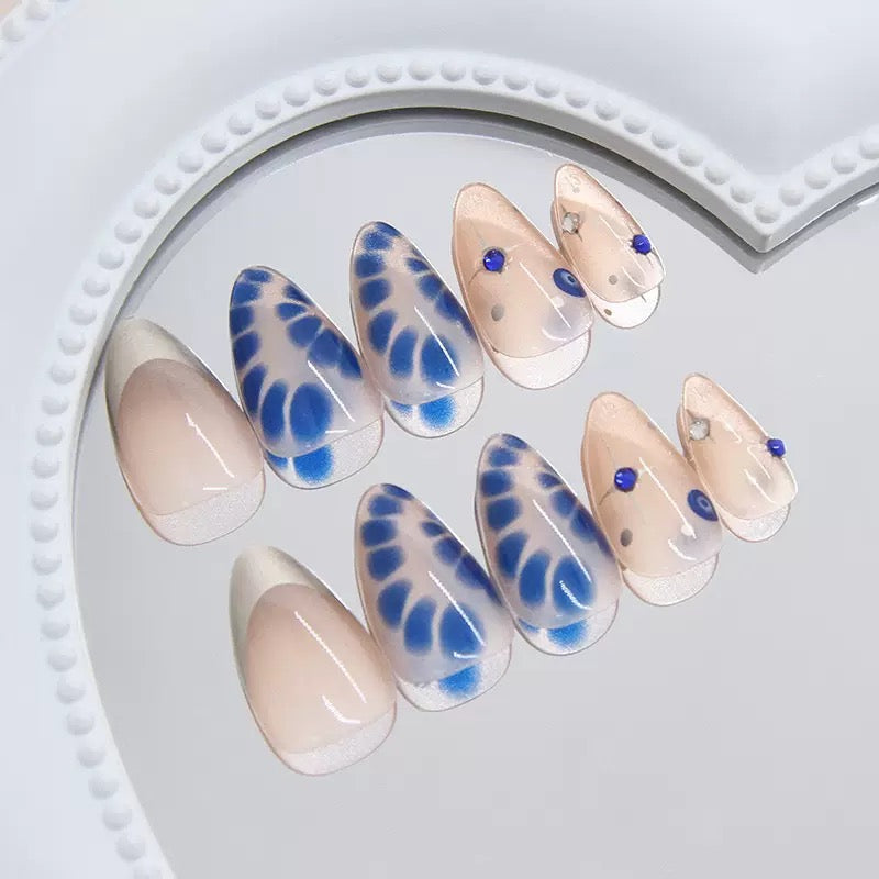 Navy blue press-on nails with geometric decor