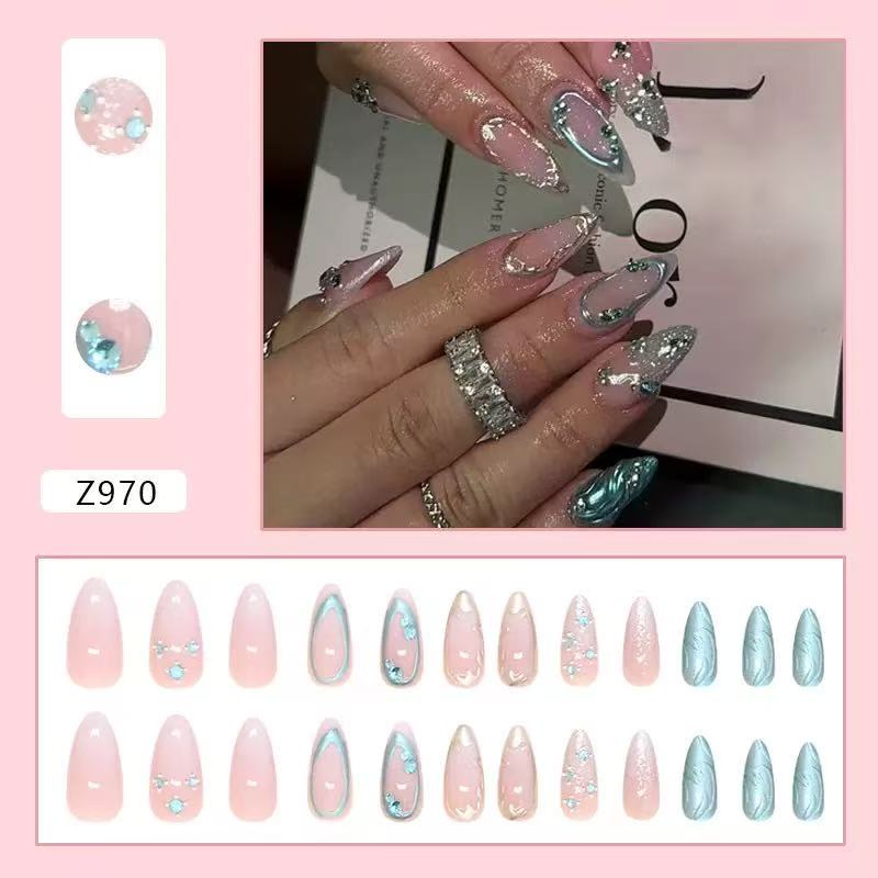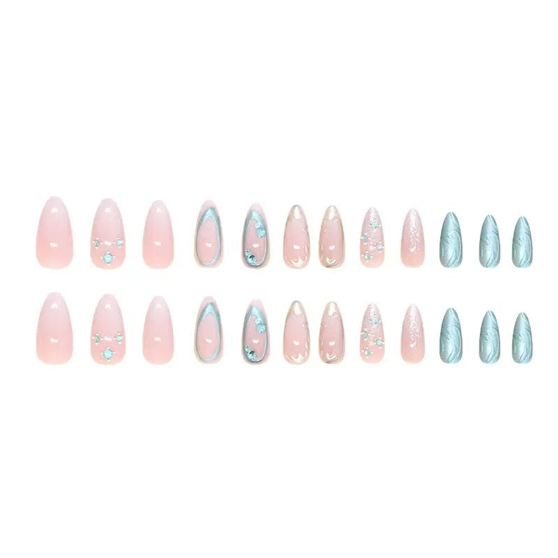 Pink-and-blue glitter stiletto nails with patterns